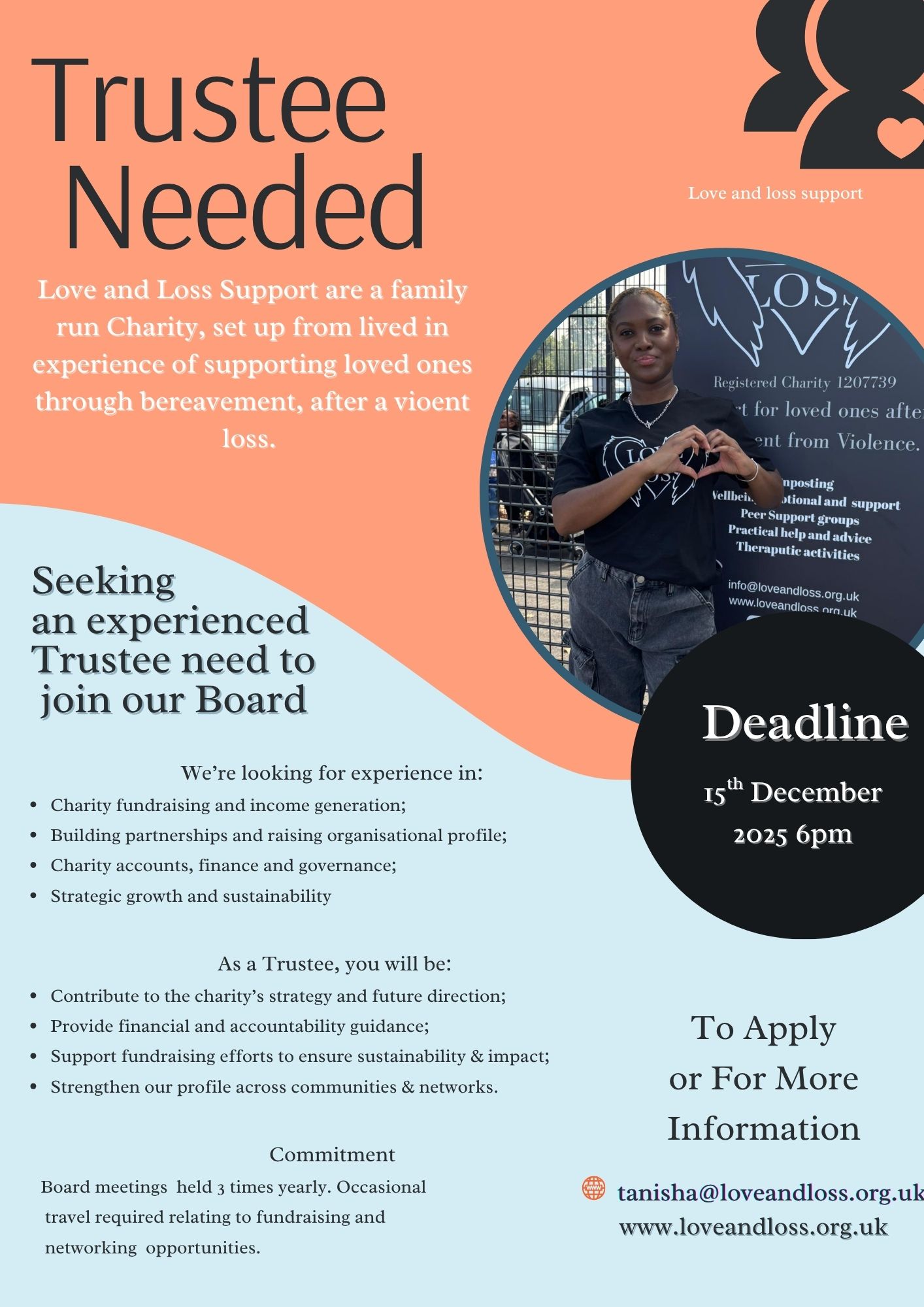 Because at Love & Loss, your contribution as Trustee will make a real and lasting difference. You’ll help transform grief into practical support, isolation into community, and loss into hope.